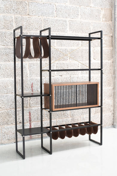 The system is custom made and can be adapted and designed for each customer according to their needs. Additional elements can be added to the system such as wooden boxes, shelves for wine glasses, a bench, a desk, leather hangers for wine bottles and more.